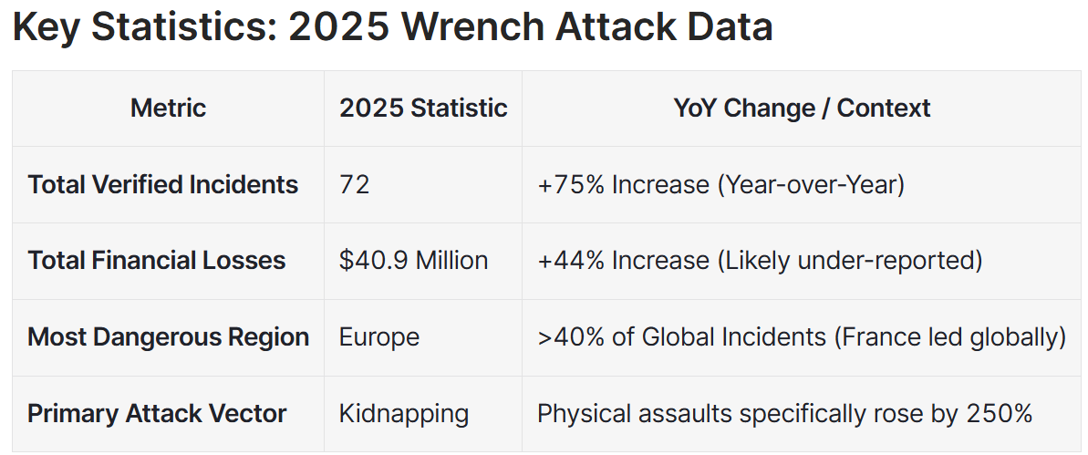 За даними платформи кібербезпеки CertiK, фізичні атаки, спрямовані на інвесторів у криптовалюту, також відомі як «атаки гайковим ключем», протягом 2025 року також зросли на 75% до 72 перевірених випадків у всьому світі.
