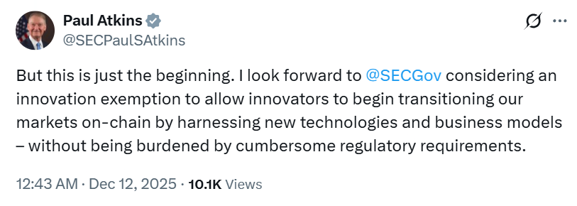 «Фінансові ринки США готові перейти на ланцюжок», — написав Пол Аткінс, голова SEC, у п’ятничній публікації X, додавши, що агентство «використовує нові технології, щоб забезпечити це майбутнє на ланцюжку».