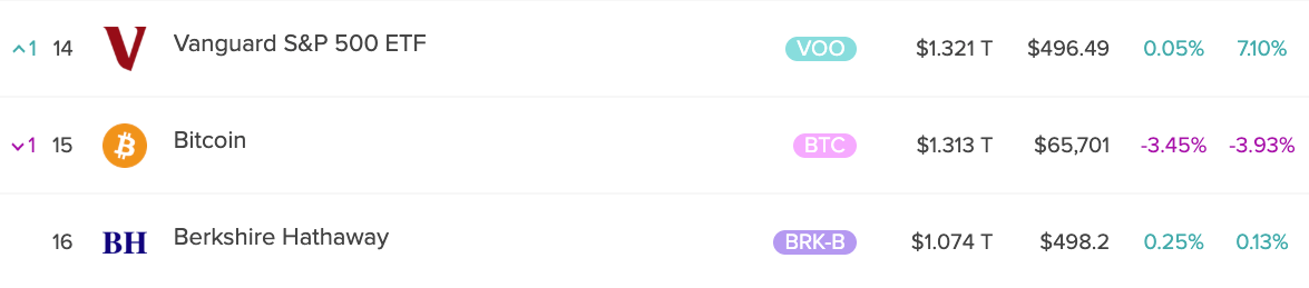 За даними 8marketcap, ринкова капіталізація біткойна також знизилася приблизно до 1,31 трильйона доларів США, відстаючи від Vanguard S&P 500 ETF (VOO) і опустившись до 15-го місця в світі на тлі поточного розгрому ринку криптовалют.