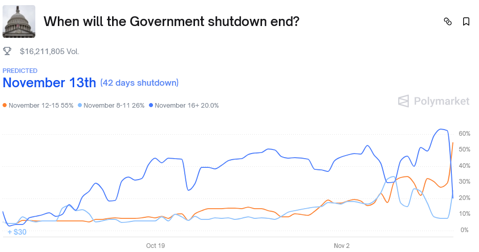 Парі на ринку прогнозів Polymarket стверджують, що державне припинення роботи буде скасовано в четвер, і ринок демонструє 54% ймовірність, що це станеться між вівторком і п’ятницею.