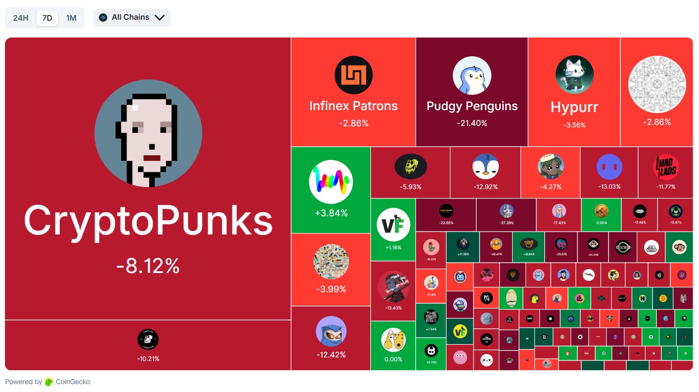 Cryptopunks, збір NFT номер один за ринковою капіталізацією, знизився на 8% на щотижневих діаграмах і майже на 5% на 30-денній діаграмі продуктивності NFT.