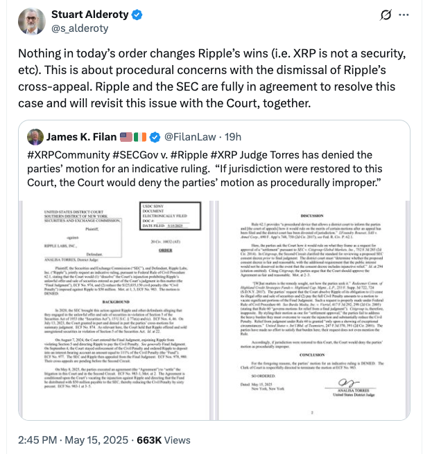 Згідно з документом суду, Торрес відмовив у клопотаннях як “процедурно неправильному”, оскільки SEC та Ripple не подали правильного процедурного клопотання про підтримку запропонованого врегулювання.