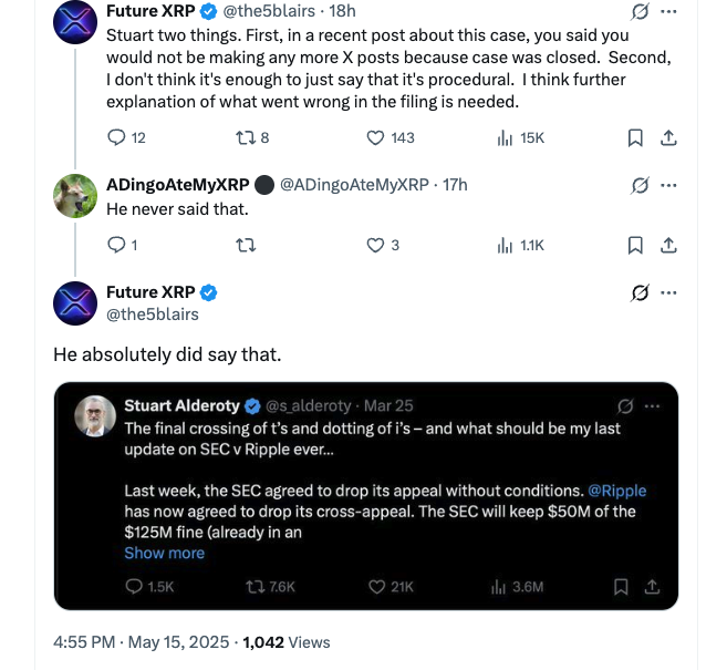 “По -перше, в недавньому дописі про цю справу ви сказали, що більше не будете робити повідомлення X, оскільки справа була закрита”, – один спостерігач XRP відповів на Alderoty в The Thread.