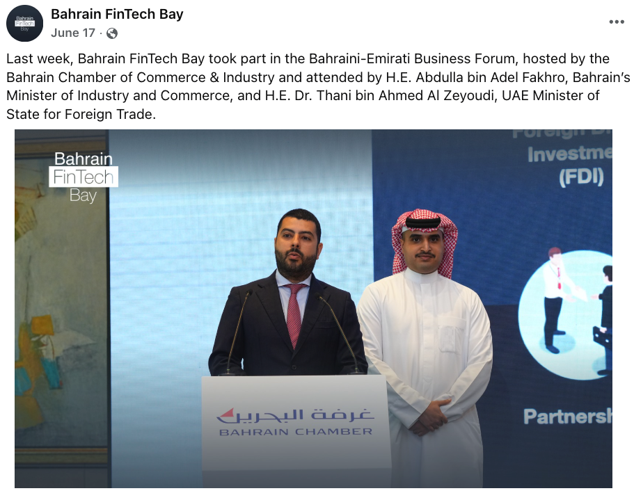 У червні BFB також брав участь у бізнес-форумі Bahraini-Emirati, який проводив Бахрейнську торгову палату та промисловість, а керівник BFB Тарік Маттар вийшов на сцену на заході, щоб обговорити розвиток Fintech Bahrain.