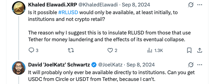 Головний директор з технологій Ripple Девід Шварц також запропонував RlusD “, мабуть, коли -небудь буде доступний безпосередньо для установ”, що викликає дискусію щодо його потенційно призначеної ексклюзивності для підприємств.