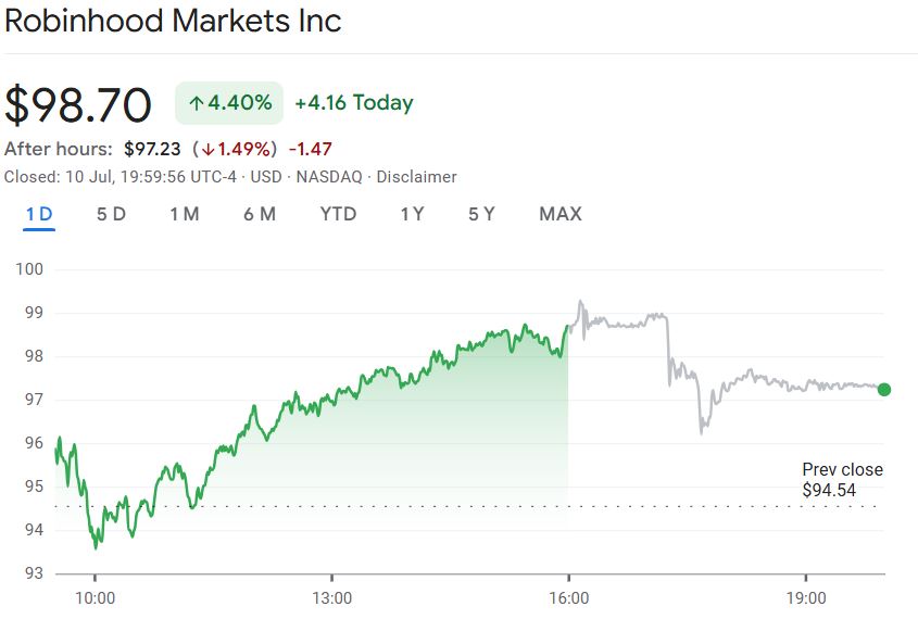 Інвестори Robinhood, здавалося б, знищували новини про зонд Флориди, а акції закрили торгову сесію в четвер на 4,4% до 98,70 доларів США поряд із ралі ринку криптовалют.