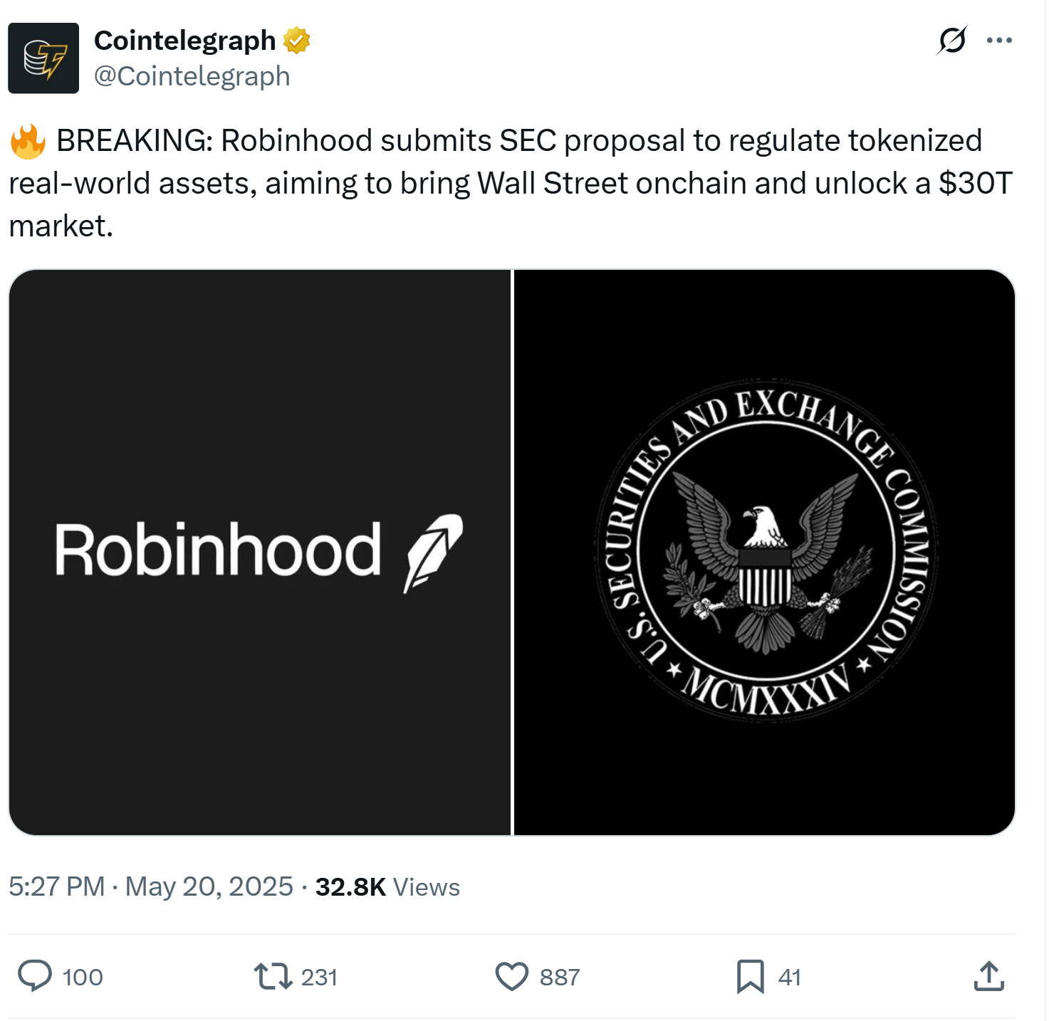 Robinhood подав пропозицію на 42 сторінки до Комісії з цінних паперів та бірж США (SEC), закликаючи до Національної основи регулювати токенізовані активи в реальному світі (RWA).