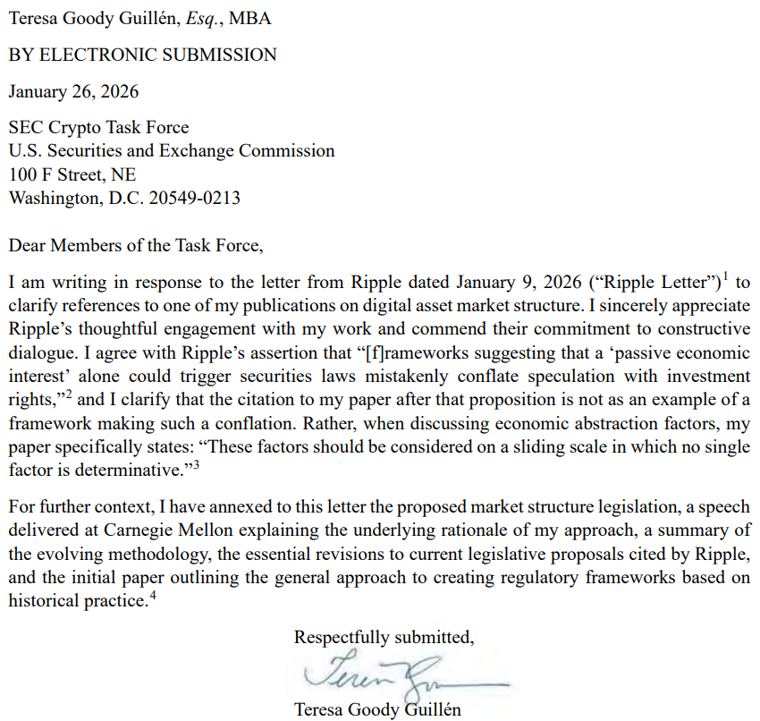 Окремо Гільєн опублікував проект для обговорення «Закону про реструктуризацію цифрових ринків 2026 року», який не був схвалений керівництвом SEC або Комісії з торгівлі товарними ф’ючерсами. У проекті пропонується класифікувати певні криптовалюти як «інструменти цифрової вартості», якщо вони не вписуються в існуючі категорії, такі як цінні папери або товари.