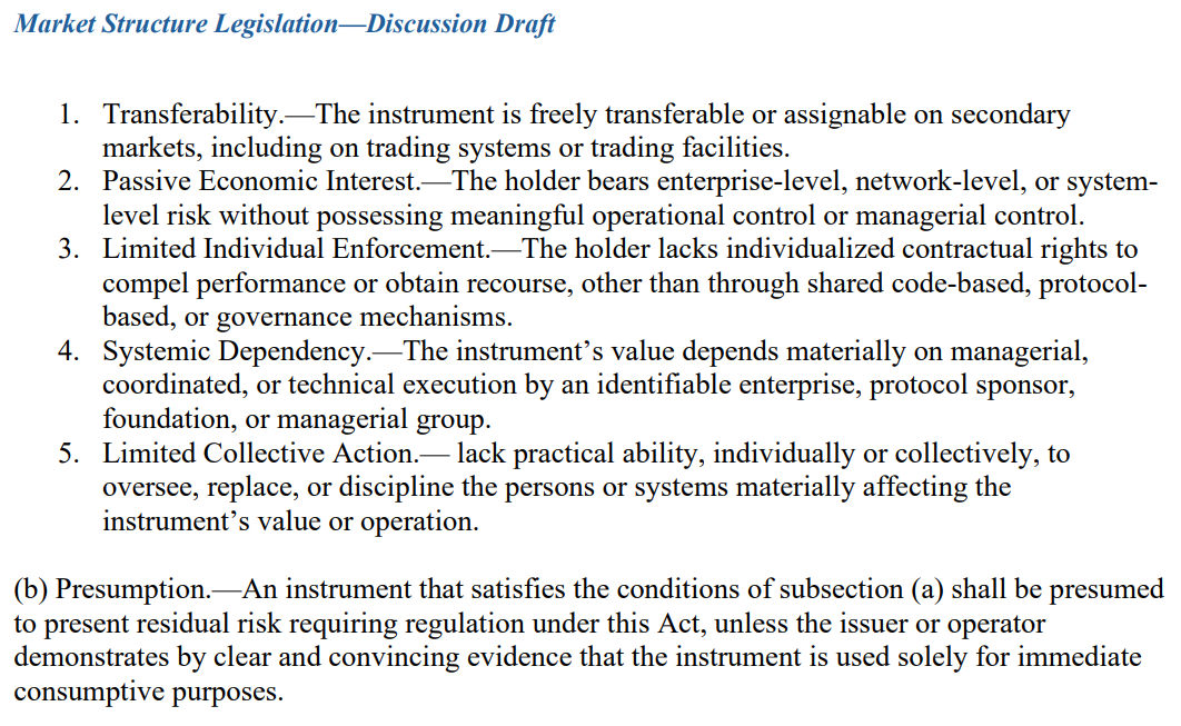 Криптовалюти вважатимуться Інструментами цифрової цінності, якщо вони демонструватимуть принаймні три з п’яти характеристик: вільну передачу, наявність пасивного економічного інтересу для власників, надання власникам обмежених індивідуальних договірних прав, системну залежність від підприємства чи спонсора протоколу або відсутність здатності дисциплінувати чи замінювати системи, що впливають на вартість інструменту чи операції.