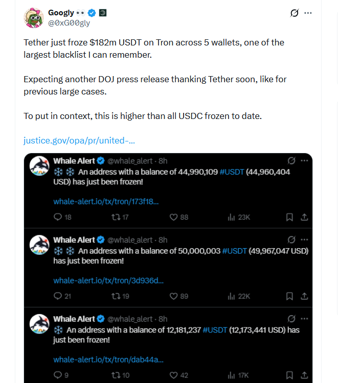 Повідомляється, що на вихідних фірма збільшила цю цифру, заморозивши USDT на основі Tron на суму 182 мільйони доларів у п’яти гаманцях;однак не було підтверджено, що це стосується Венесуели чи Ірану.