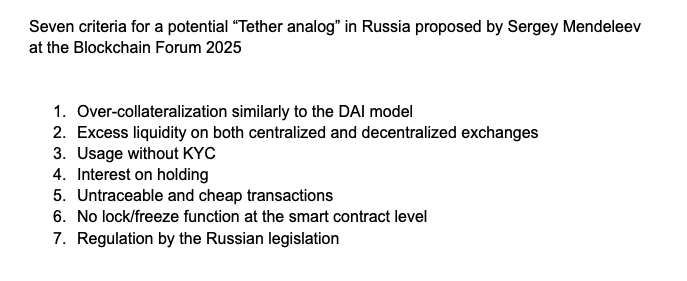 Сергій Менделєєв, засновник цифрового обміну врегулюванням, виходить і неактивний засновник санкціонованої біржі Гаранекс, висунув сім ключових критеріїв для потенційної «репліки тетера» у основному домі на форумі blockchain 23 квітня.