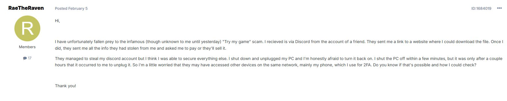 У лютому користувач під рукою Raetheraven опублікував на форумі Malwarebytes, що вони стали здобиччю до “сумнозвісної афери” після того, як хтось, на кого вони думали, що друг надіслав посилання. Форум Reddit, який розпочався в липні, також попередив про афери, спрямовані на геймерів.