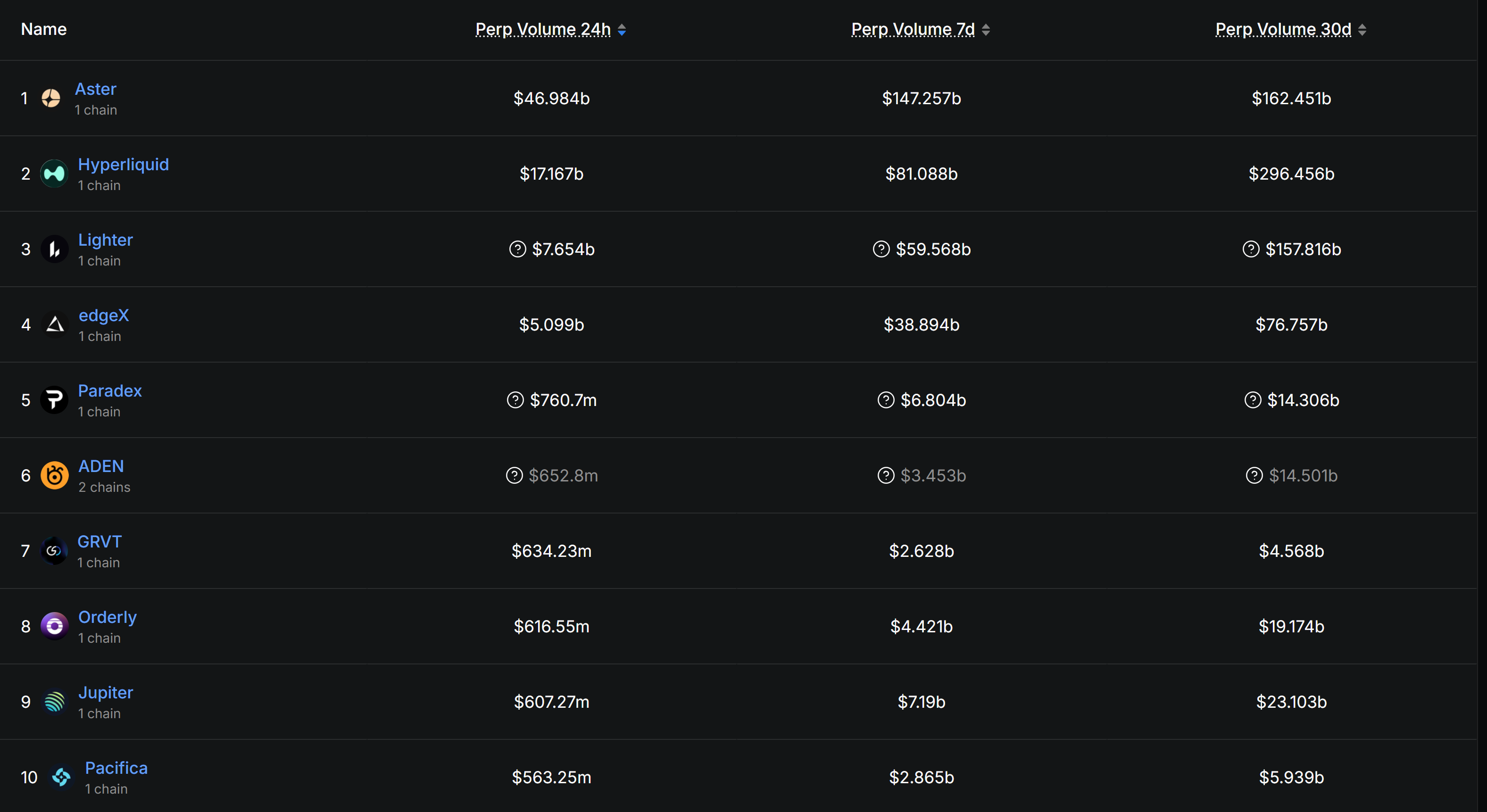 “Нещодавно стимулюючі кампанії Астера підштовхнули свій щоденний обсяг перп, щоб записати рівні, навіть обігнавши гіперліквід у певні дні”, – сказав Елкале. Протягом останнього дня Астер зареєстрував близько 47 мільярдів доларів обсягу PERP, що більше, ніж подвійний обсяг Hyperliquid в 17 мільярдів доларів, згідно з даними Defillama.