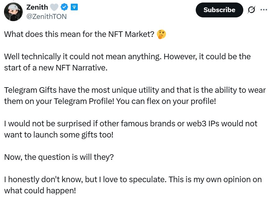 “Подарунки Telegram мають найбільш унікальну корисність, і це здатність носити їх у вашому профілі телеграми”, – сказав Зеніт.