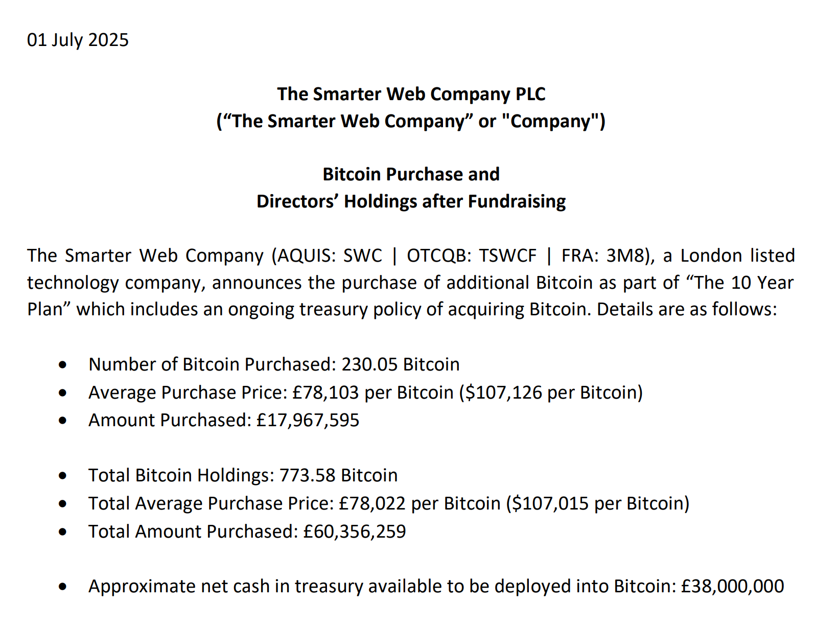 Зараз фірма, що перераховується в Лондоні, має 773,58 BTC, придбану за середньою ціною 78 022 фунтів (107 015 доларів), що призвело до загальної кількості інвестицій Bitcoin (BTC) до понад 82,6 мільйонів доларів, згідно з поданням у вівторок.