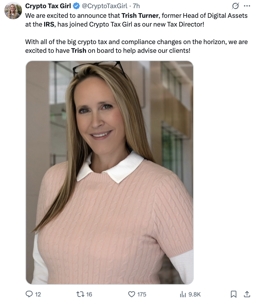 Податок Bloomberg повідомив у п’ятницю, що Тернер повідомив публікації під час інтерв’ю, що вона стане податковою директором у податковій фірмі криптовалюти з податкової дівчини. Того ж дня засновниця з податку на криптовалюту Лаура Уолтер заявила в пості LinkedIn, що Тернер приєднається до фірми.