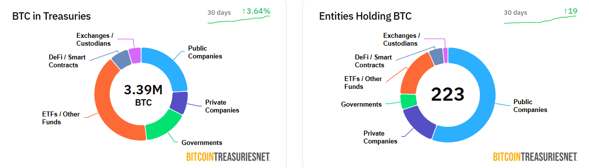 Щонайменше 124 публічні компанії зараз тримають Bitcoin у рамках своєї корпоративної скарбниці, згідно з даними BitcoinTreasuries.net.