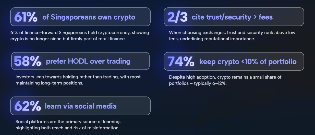 У четвер спільне опитування, проведене фінансовою платформою MoneyHero та криптовалютною біржею Coinbase, показало, що 61% «підкованих у фінансах» інвесторів у Сінгапурі зараз тримають криптовалюту, а довіра є основним вирішальним фактором для вибору бірж, випереджаючи комісію.