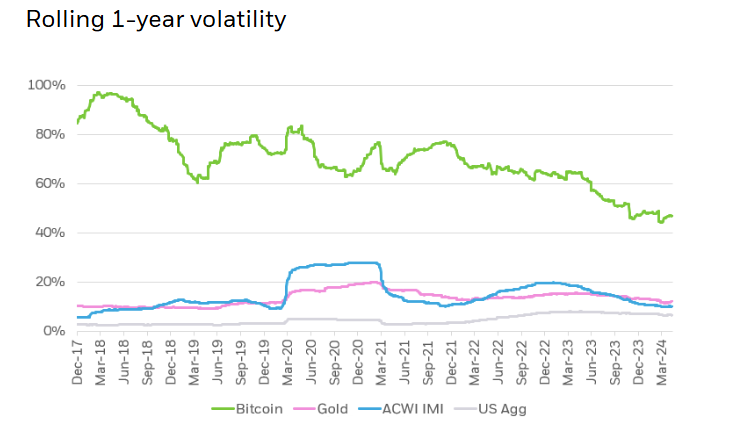 “Нестабільність біткойна залишається підвищеною на 3,9 і 4,6 рази більше, ніж золоті та глобальні акції відповідно”, – повідомляє Blackrock.
