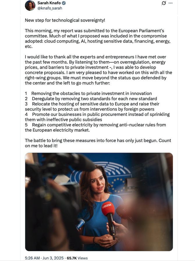ITRE, один із 24 постійних комітетів у Європейському парламенті, 3 червня прийняв необов’язковий звіт про технологічний суверенітет та цифрову інфраструктуру, закликаючи до європейської політики для цифрової екосистеми.