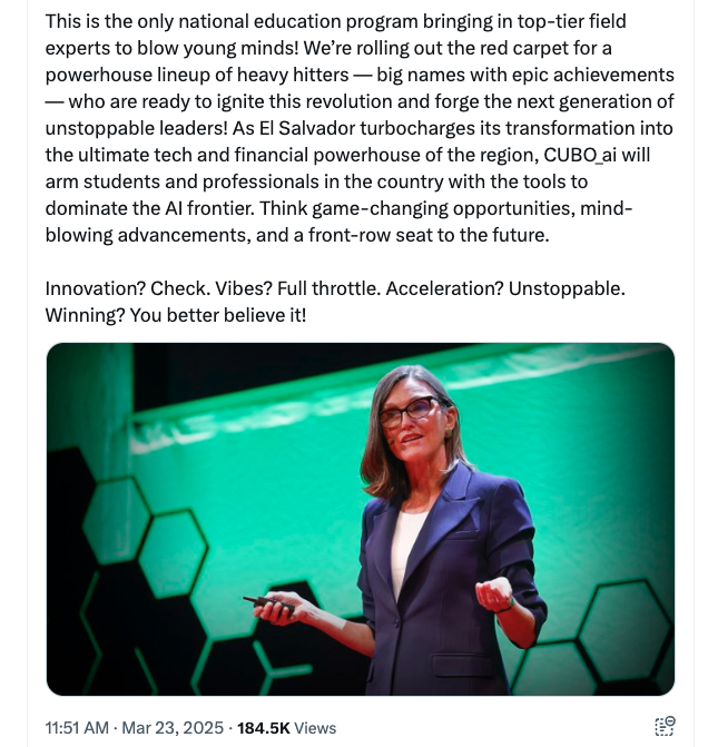 У березні 2025 року ONBTC оголосив програму AI на державній освіті на державній освіті Сальвадора на державну освіту, рекламуючи це як “єдину національну програму освіти, що приносить фахівці з вищого рівня”. Програма була оголошена за підтримки великої біткойн -Бул Кеті Вуд, яка, як очікується, прочитає першу лекцію в рамках програми.
