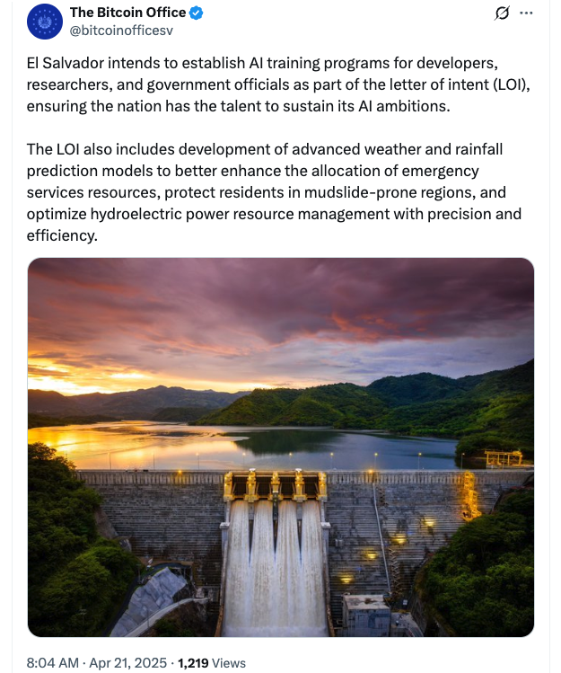 Сальвадор підписав лист про наміри співпрацювати з Nvidia на “Суверенному ШІ, щоб сприяти інноваціям та економічному зростанню”, Національний офіс біткойна (ONBTC) Ель -Сальвадор оголосив X 21 квітня.