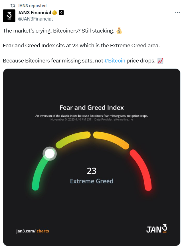 “Ринок плаче. Біткойнери? Все ще накопичуються. Індекс страху та жадібності знаходиться на рівні 23, що є зоною надзвичайної жадібності. Тому що біткойнери бояться втратити сати, а не падіння цін на біткойни”, – повідомила компанія в середу.