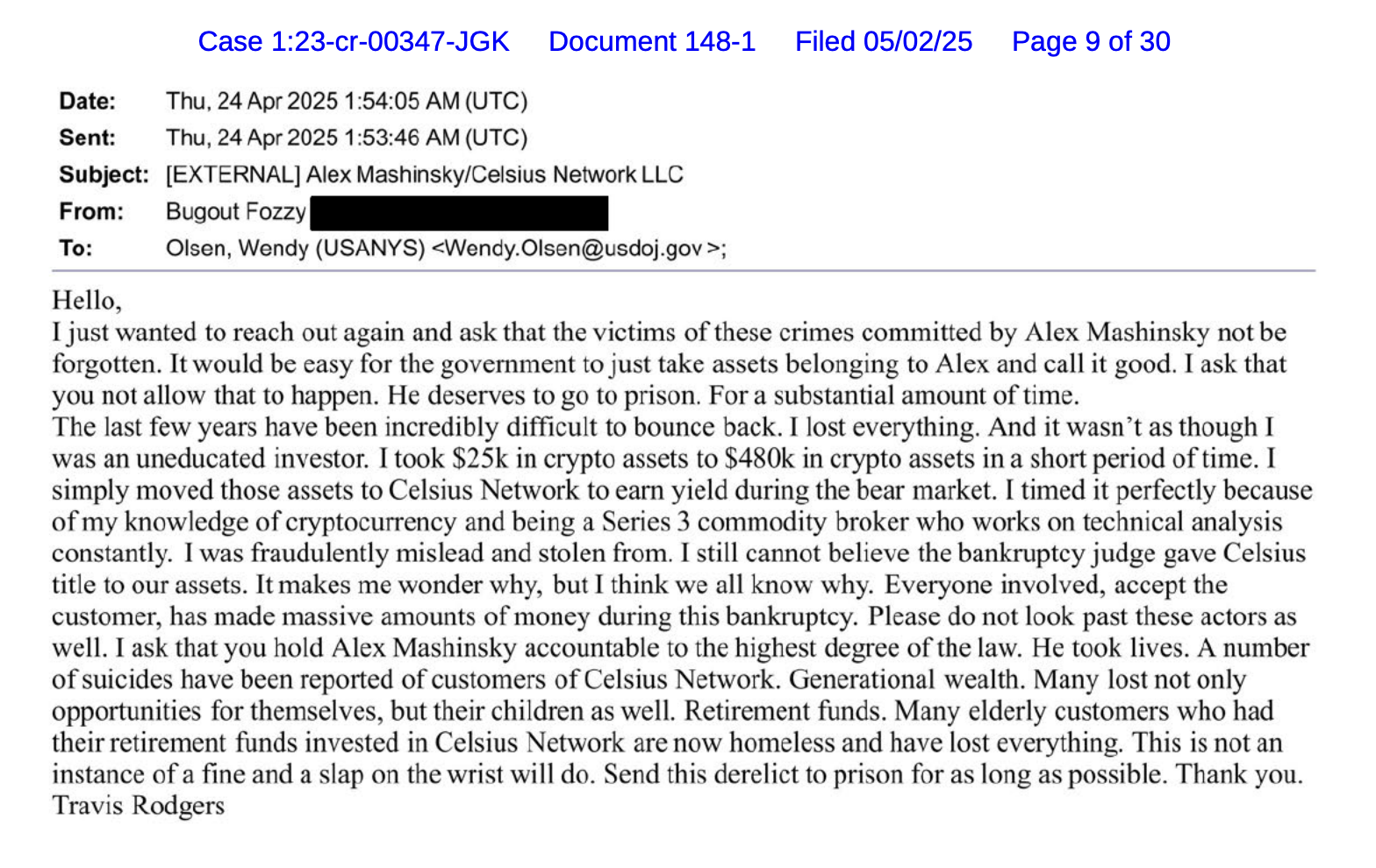 У поданні 2 травня в окружному суді США в Південному окрузі Нью -Йорка (SDNY) прокурори оприлюднили кілька заявок про вплив від осіб, постраждалих від краху Цельсія, поданого після початкового терміну. Хоча принаймні один запропонував помилування для колишнього генерального директора, багато хто заявив суду про фінансові та особисті збитки, спричинені криптовалютною фірмою, подаючи заяву про банкрутство, і натякнула, що Машинський повинен нести відповідальність за неправильне представлення компанії.