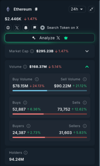 На відміну від зростання участі Ethereum на ланцюзі, також спостерігалося збільшення обсягу продажу ланцюга порівняно з обсягом купівлі. Data Nansen вказує, що в 168,37 мільйона доларів на обсяг купівлі, зафіксованого за 24-годинний період, приблизно 78,15 мільйонів доларів спрямовувались на покупки, а трохи більше 90 мільйонів доларів-від продавців.