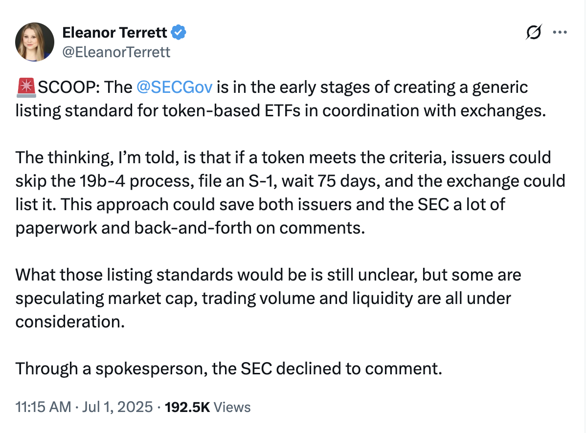 Терретт каже, що деталі пропозиції, включаючи критерії придатності для криптовалют, що мають право на прискорений процес, ще не підтверджені емітентами та регуляторним органом.