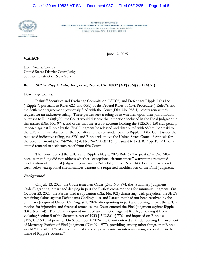 Ripple та Комісія з цінних паперів та бірж Сполучених Штатів (SEC) подали спільний клопотання в четвер про звільнення 125 мільйонів доларів коштів, що зберігаються на рахунку депозитного періоду, щоб сплатити за врегулювальні витрати, наказані судом.