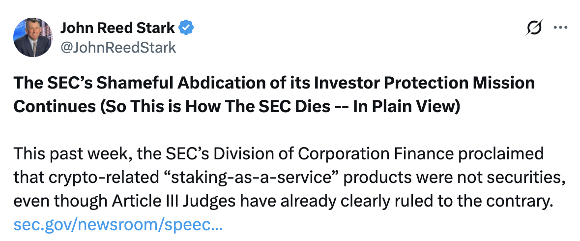 “Ось так гине SEC – на погляд”, – написав Старк у тривалому відгуку агентства, називаючи зміну “ганебним відхиленням від своєї місії захисту інвесторів”.