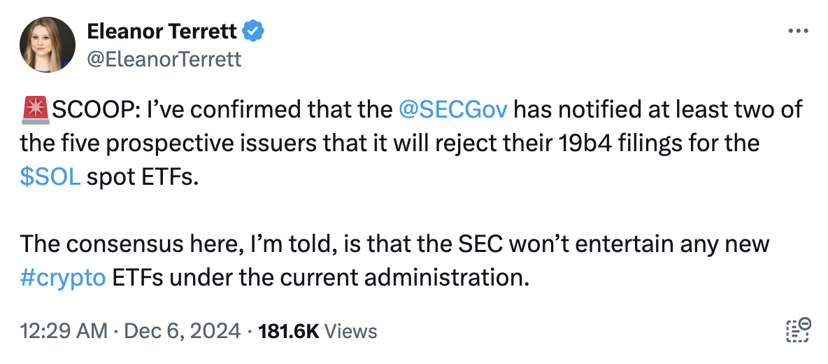 «Мені сказали, що консенсус тут полягає в тому, що SEC не буде приймати жодних нових #cryptocurrency ETF за нинішньої адміністрації», — сказав Терретт 6 грудня.