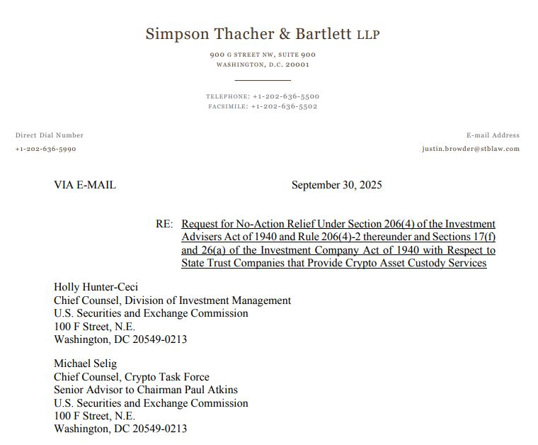 Юридична фірма Simpson Thacher & Bartlett надіслала лист до підрозділу у вівторок, бажаючи запевнити, що зареєстровані фінансові установи, такі як фірми венчурного капіталу, не підлягатимуть виконавці регулятора, якщо вони опікують активи криптовалют.