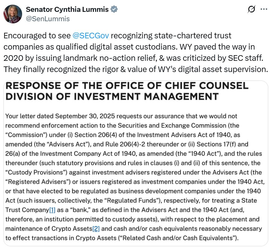 Тим часом сенатора Вайомінгу Сінтії Лумміс “заохочували бачити, як SEC визнає державні довірчі компанії як кваліфікованих опікунів цифрових активів”, а також зазначив, що її держава зробила аналогічний крок у 2020 році, який SEC епохи Байдена засудив у той час.