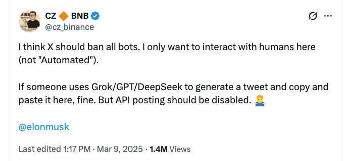 Колишній генеральний директор Binance Changpeng Zhao під назвою X для заборони всіх ботів у березні 2025 року. Джерело: Чангпенг Чжао