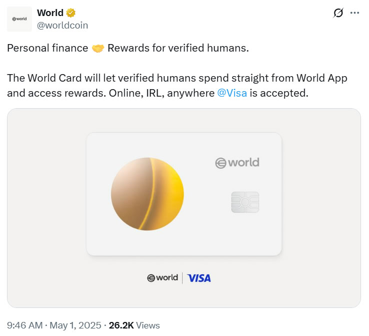Окрім світового американського розгортання, компанія заявила на заході в Сан -Франциско 30 квітня, що вона буде співпрацювати з Visa для «світової візової картки», щоб запустити пізніше цього року для тих, хто сканував очні яблука, що дозволяє виплати за допомогою токенів WLD та інших криптовалют.