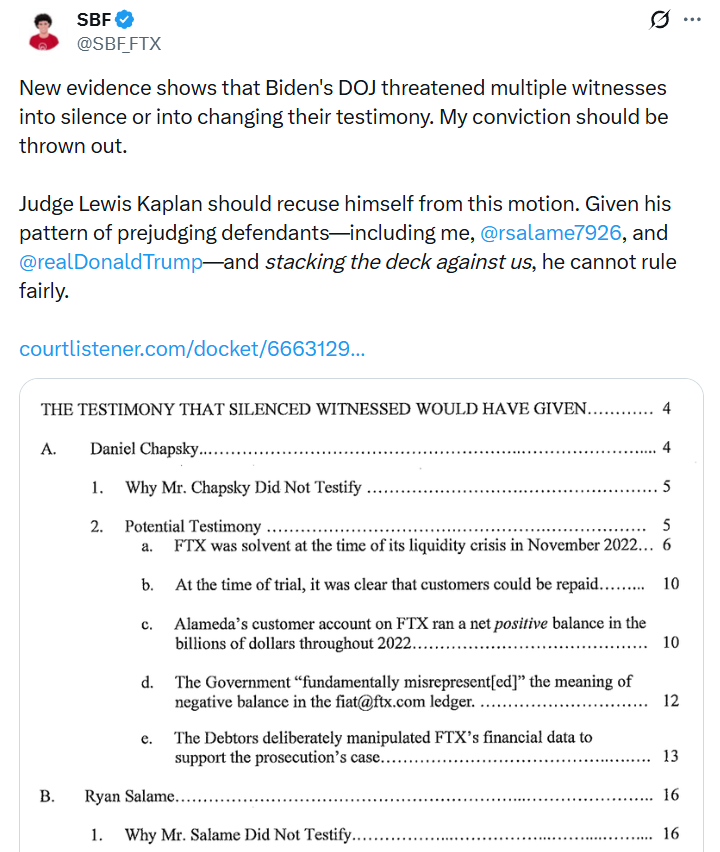 “Нові докази свідчать про те, що Міністерство юстиції Байдена погрожувало кільком свідкам, щоб вони мовчали або змінили свої свідчення. Моє засудження має бути знято”, – сказав SBF у своєму останньому дописі X із в’язниці в середу.