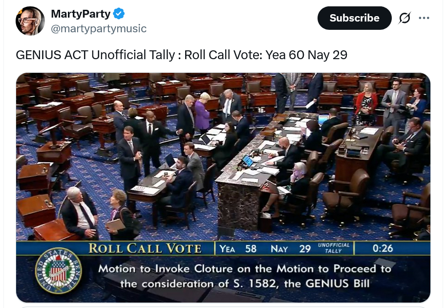 Ключовий процедурний голос за керівництвом та встановленням національних інновацій для Закону про стаблекуїн США або Закону про геній, прийнятий у голосуванні 66-32 20 травня.