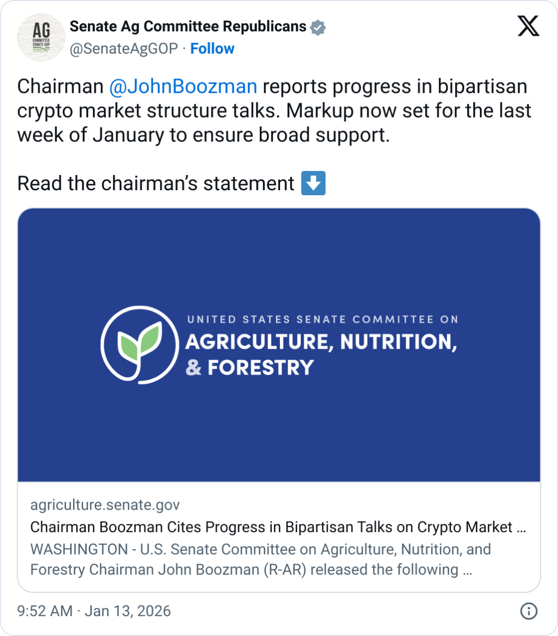 Комітет із сільського господарства Сенату США відклав розцінку законопроекту про структуру ринку криптовалют до кінця січня, заявивши, що йому потрібно більше часу, щоб отримати підтримку для цього законодавства.