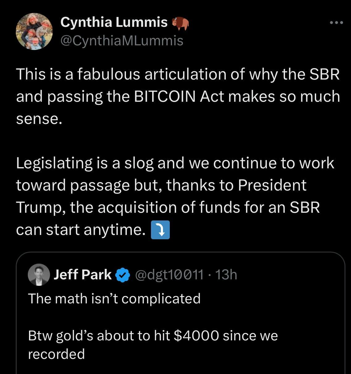 Lummis висловив коментарі у відповідь на посаду головного директора з інвестицій Procap BTC Джефф Парк, який поділився відео про себе та біткойна Бика Ентоні Помпліано, обговорюючи потенціал SBR.