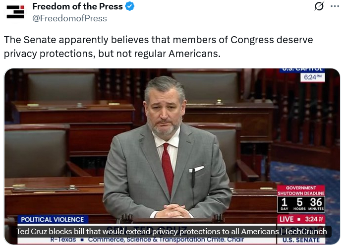Сенатор Техасу Тед Крус заблокував законопроект про конфіденційність, який прагне захистити всіх американців від того, щоб їхня особиста інформація була піддана брокерам даних – стверджуючи, що правоохоронці потребують доступу до деяких даних і що законопроект вимагає вдосконалення.