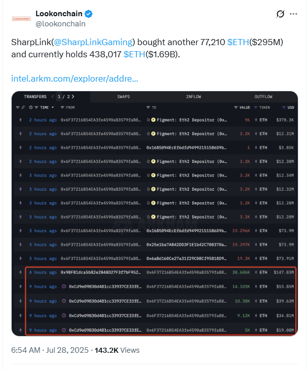 Sharplink Gaming, другий за величиною корпоративний власник Ether, придбав ще 77 210 ефірів, вартістю 295 мільйонів доларів, оскільки фірма не виявляє ознак уповільнення своєї криптовалютної казначейської гри.