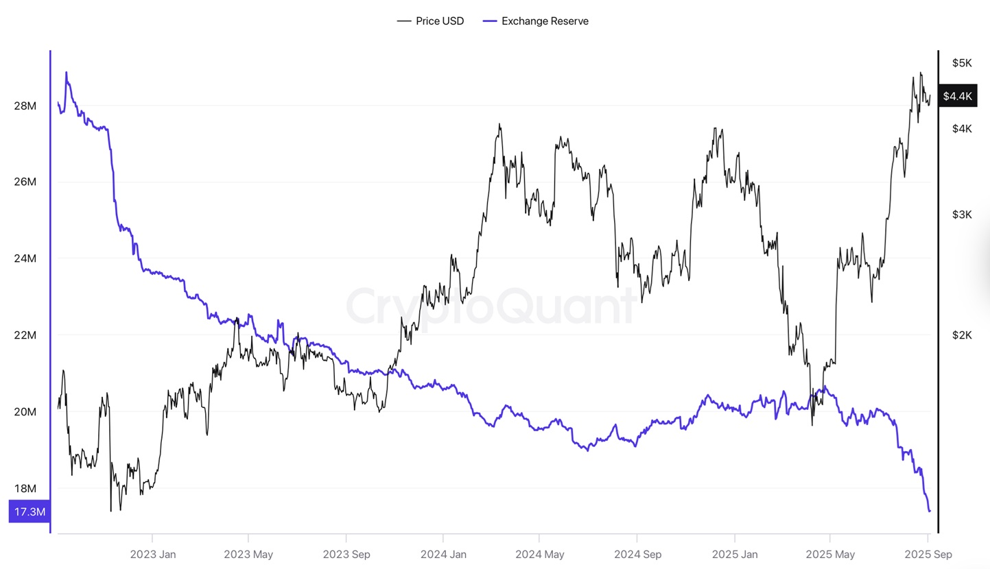Дискусія виникає як попит на ефір прискорюється. Притоки точкових ETF зросли в цьому році, тоді як кількість ETH на біржах знизилася до трирічного низького на початку вересня-зниження, пов’язане з корпоративними казначействами та поглинанням ETF.
