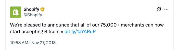Shopify опосередковано підтримує платежі Bitcoin (BTC) через інтеграцію шлюзу з принаймні 2013 року, коли компанія офіційно оголосила, що всі її 75 000 торговців були вільні почати приймати біткойн.