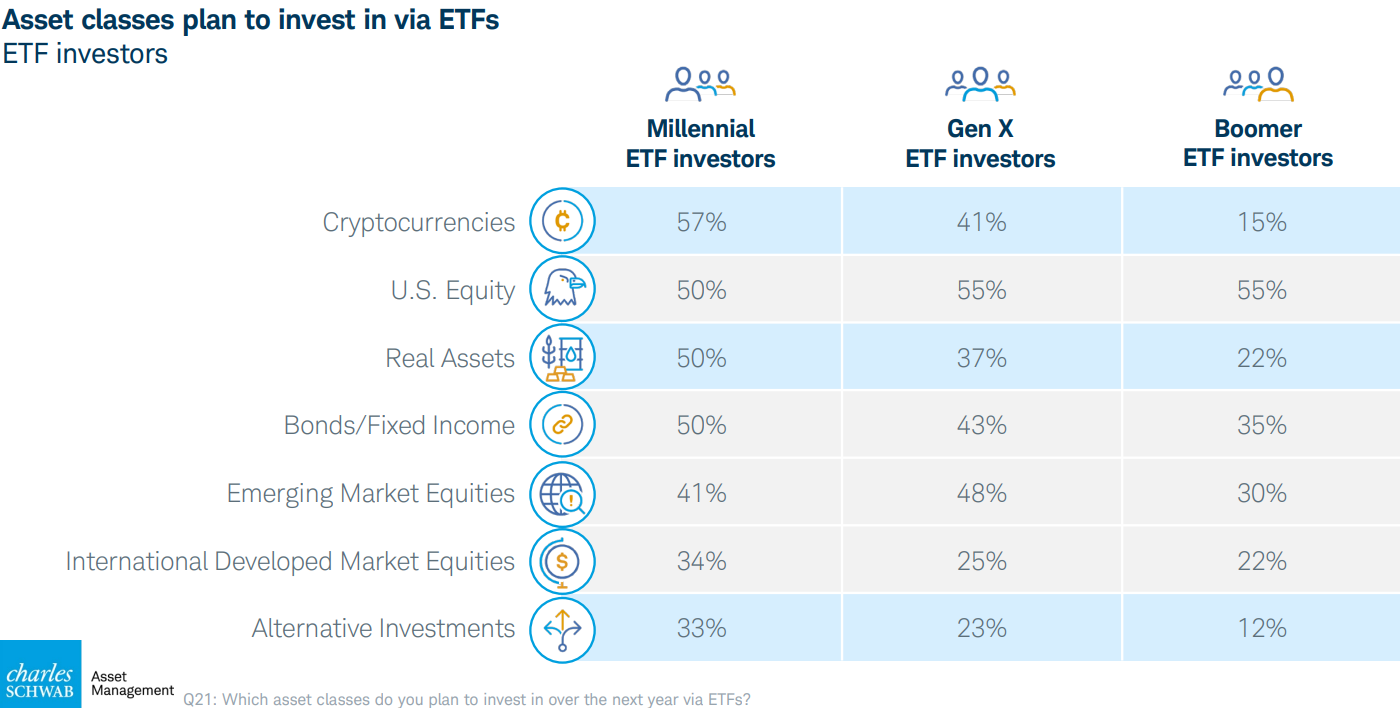 У своєму звіті ETFs and Beyond, опублікованому в четвер, Schwab виявив, що 52% респондентів планували інвестувати в акції США, тоді як 45% сказали, що їх цікавлять ETF криптовалюти, які посідають друге місце з облігаціями США.