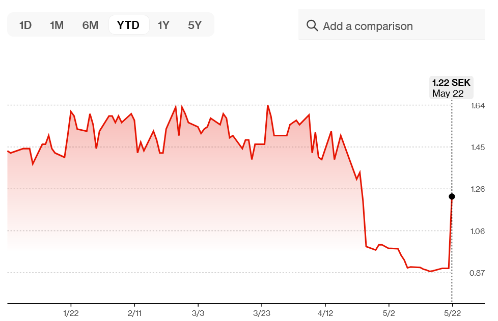 Акції компанії закрилися 22 травня, торгуючи на 37% до 1,22 шведської крони (0,13 дол.