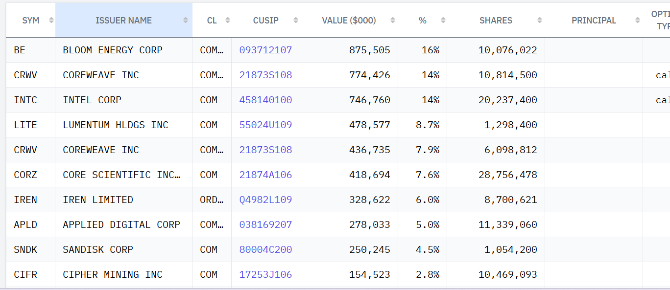 Заявка фонду 13F за 4 квартал 2025 року демонструє висококонцентрований портфель, заснований на тому, що справжніми переможцями буму штучного інтелекту будуть не чат-боти, а електростанції та центри обробки даних, які їх живлять. Situational Awareness повідомляє про 5,52 мільярда доларів США в акціонерному капіталі 29 холдингів, причому значна частка цієї вартості зосереджена в кількох назвах інфраструктур ШІ.