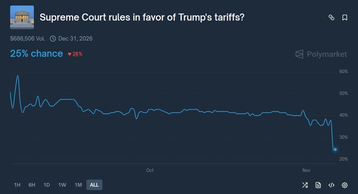 Прогнозовані ринки сигналізують про зниження впевненості в тому, що Верховний суд США винесе рішення на користь широких повноважень президента Дональда Трампа щодо тарифів, а трейдери на регульованих і криптоплатформах зменшують свій ризик після подій тижня.