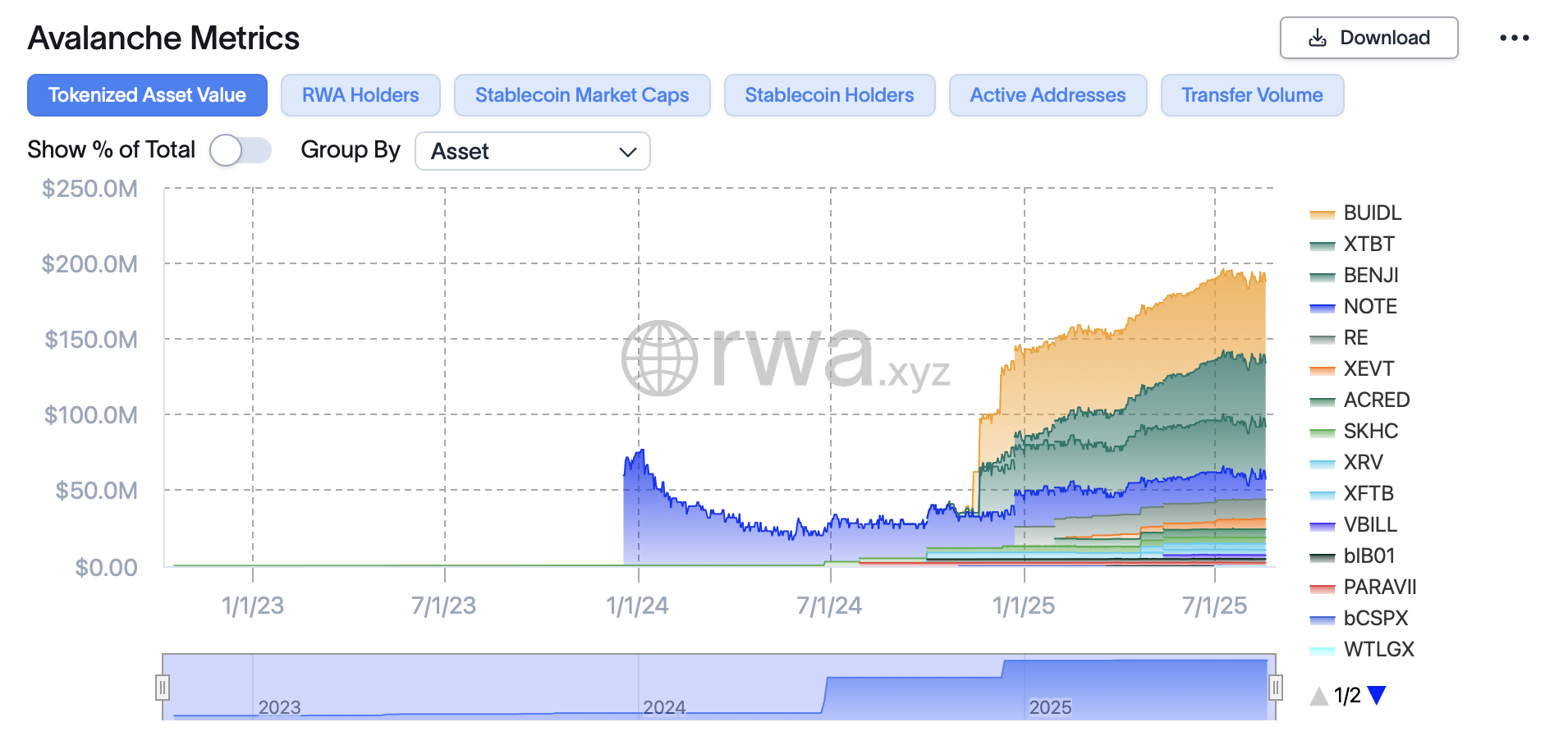 Avalanche, блокчейн Layer-1, в якому розміщений маркер рідної лавини (Avax), має 1,9 мільярда доларів загальної вартості, заблокованої на цьому письмі, повідомляє Defillama. Блокчейн має 188 мільйонів доларів у реальному світі (RWA) вартості токенізації, згідно з RWA.xyz, рейтинг 12-е серед усіх блокчейнів.